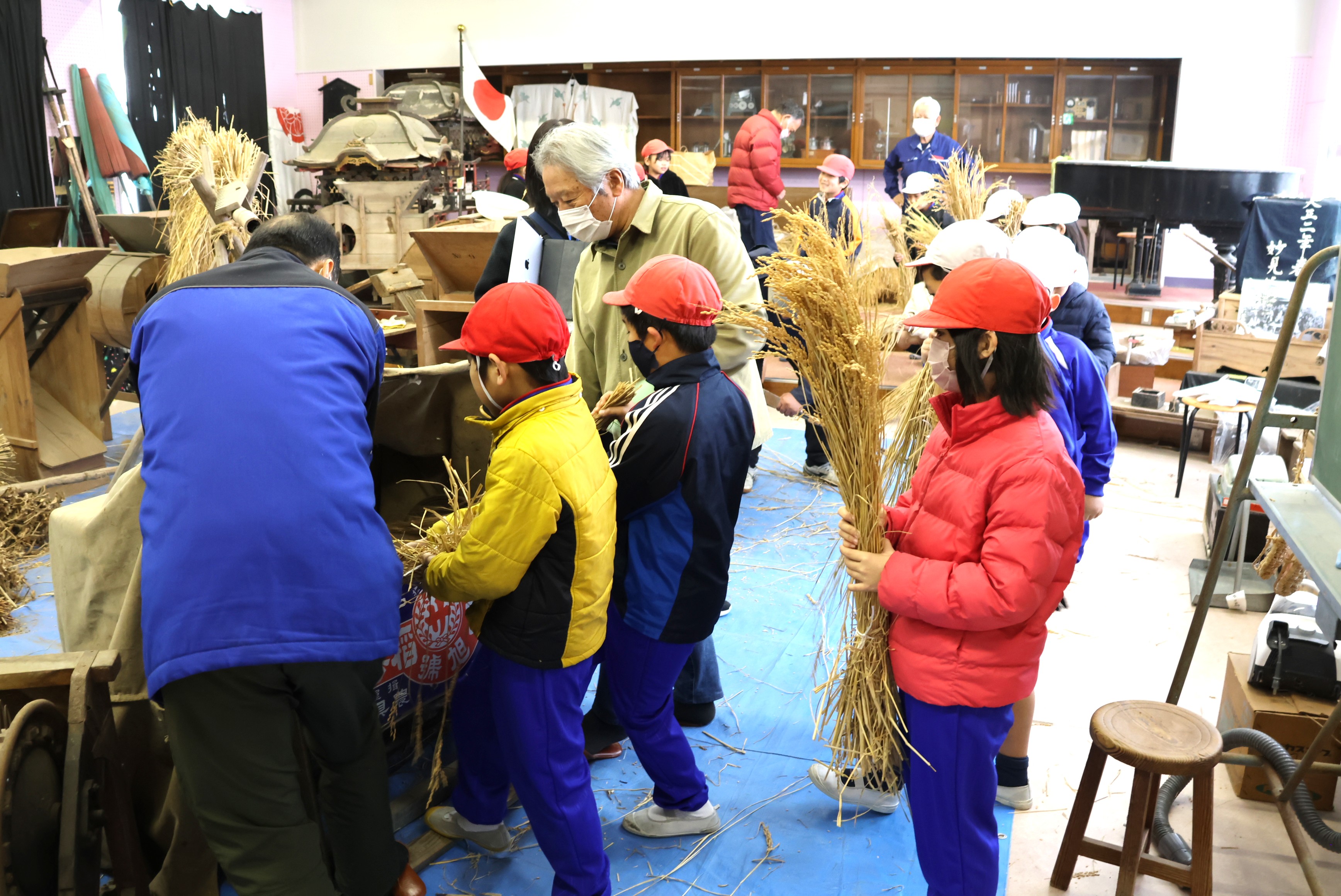 児童たちは脱穀体験をしたり、見学した展示品に〇を付けて行きながら全ての部屋を見て回り、