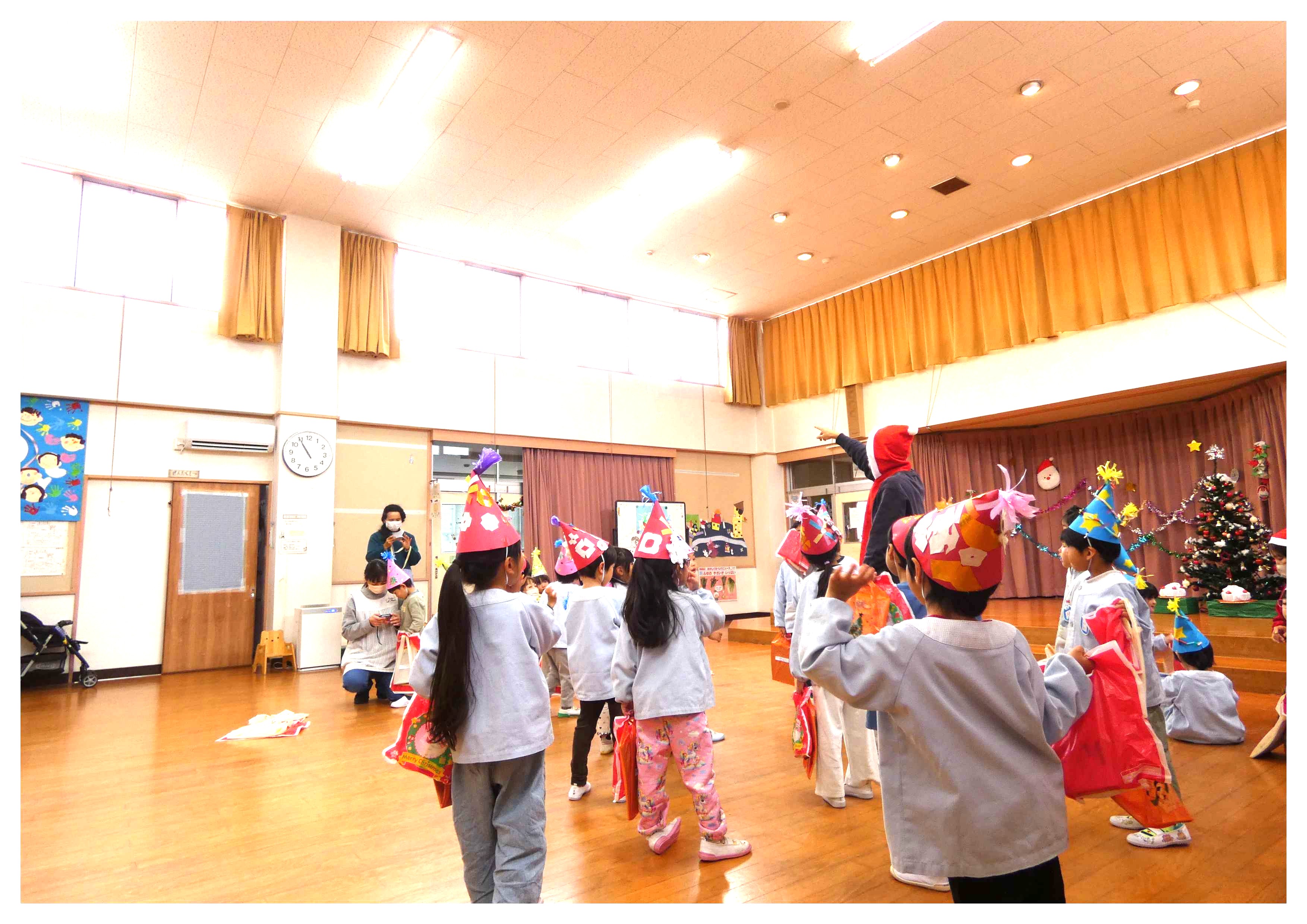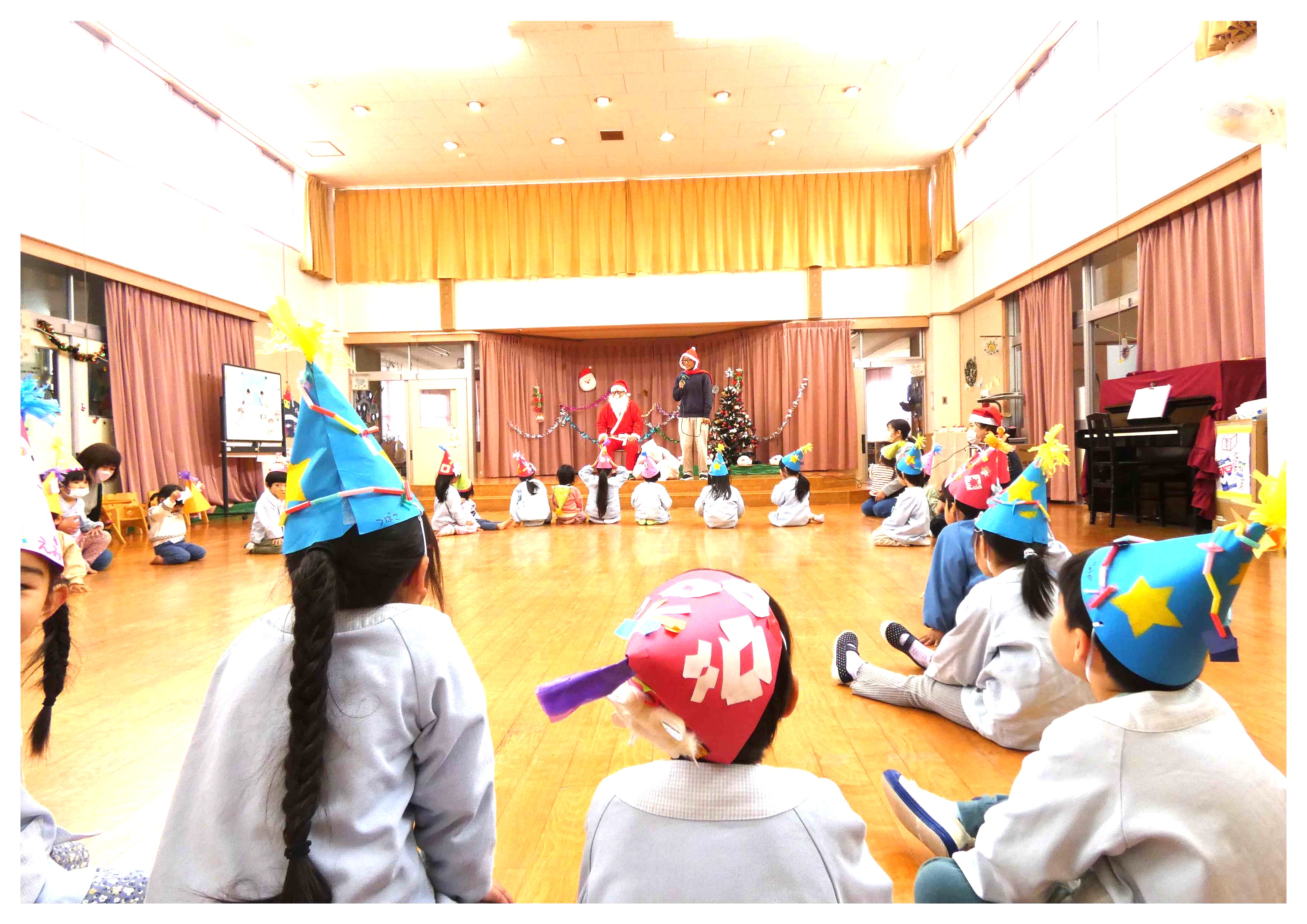 まで、クラスごとに違ったデザインの手作り三角帽を被り、『ジングルベル』の曲に合わせて踊り