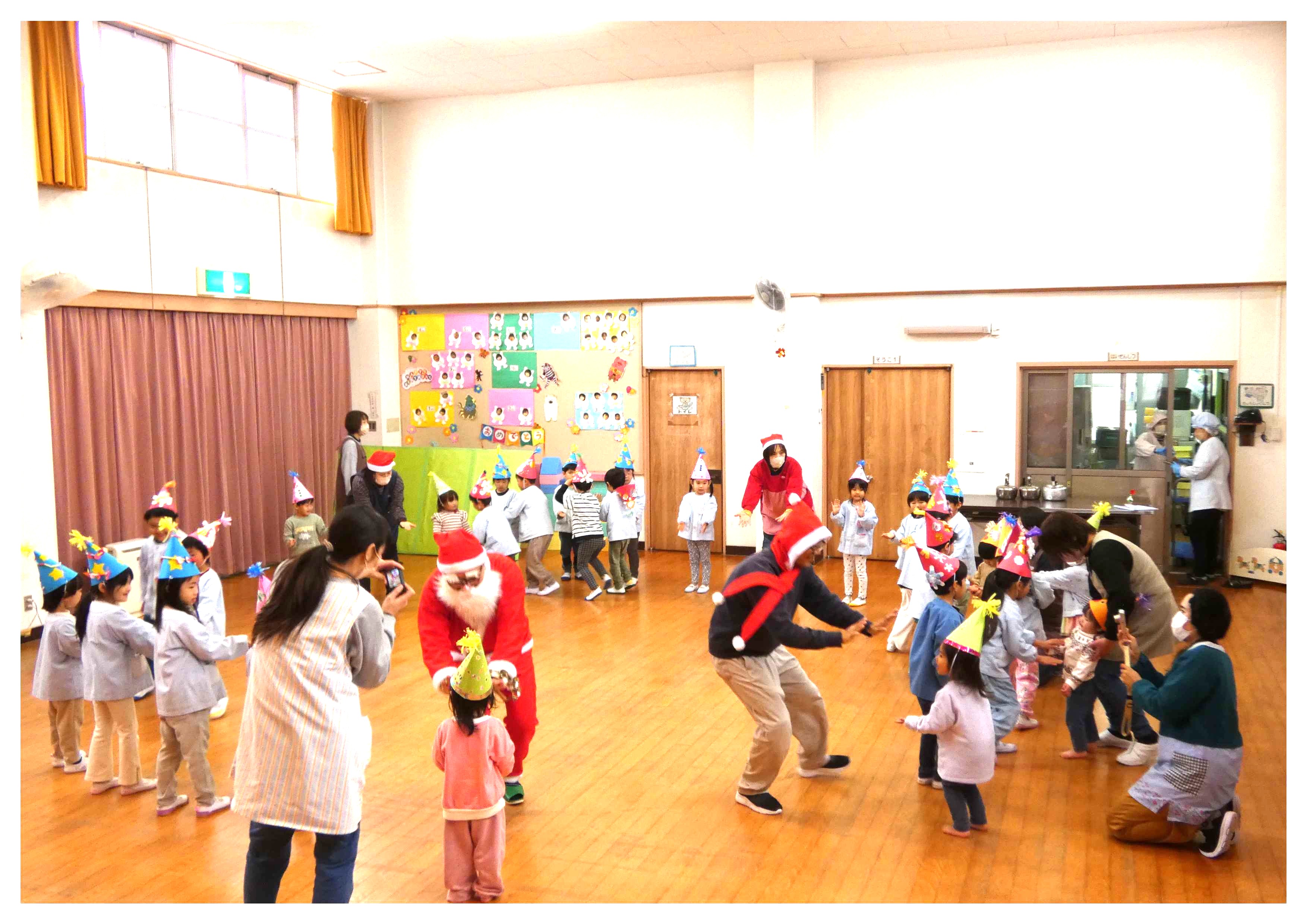 してかくれちゃった子も。サンタさんと一緒に『クリスマス クリスマス』の曲に合わせて踊った