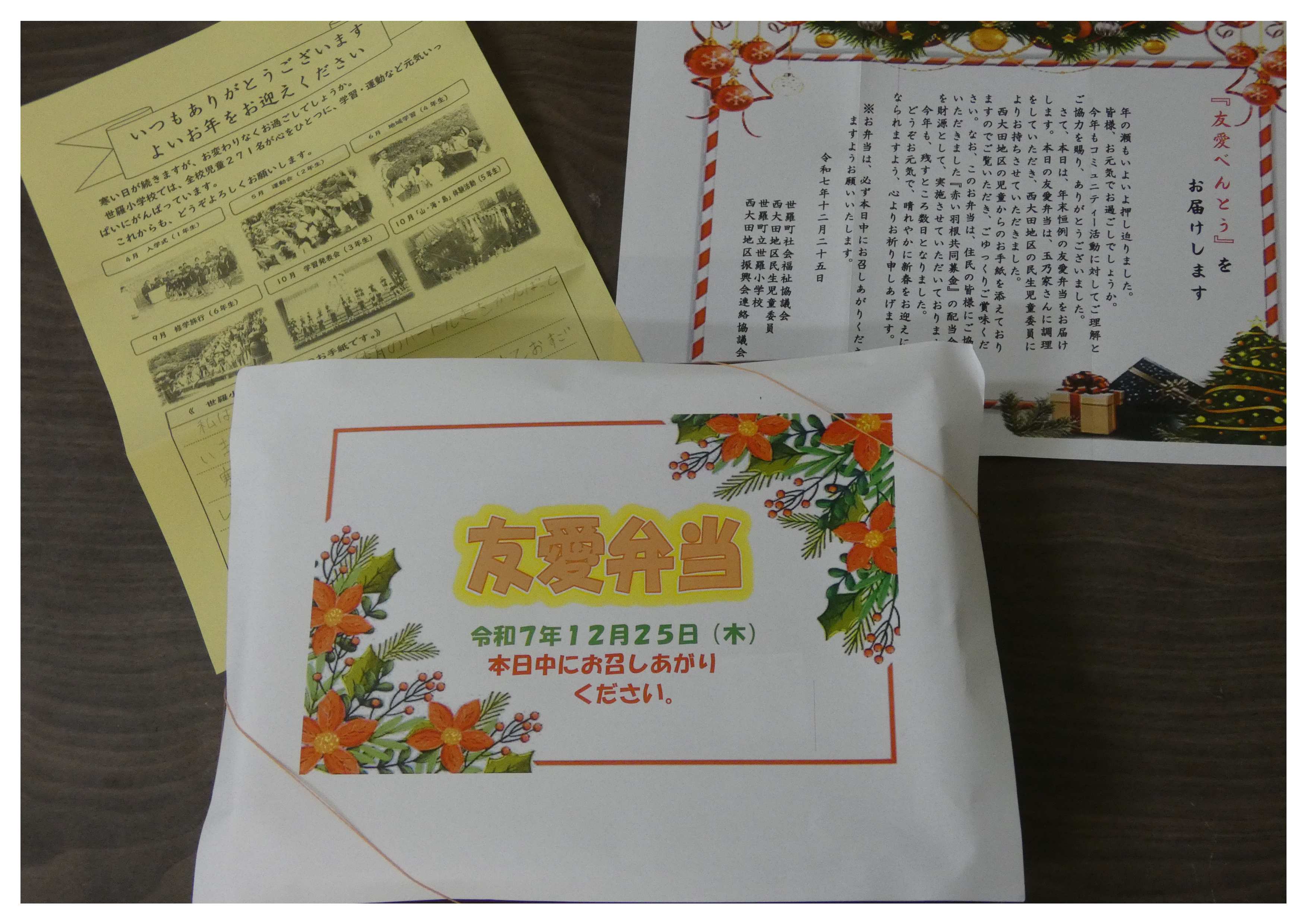 今年は「玉乃家」さんに調理していただいたお弁当へ小学生からの手紙を添え、一軒一軒