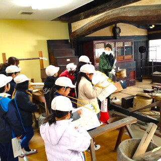 民俗資料館の見学に来られ、民俗資料保存会の皆さんが学習のお手伝いをされました。