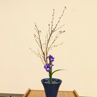 今月は、生花正風体(2種生け)で、彼岸桜とアイリスを生けました。