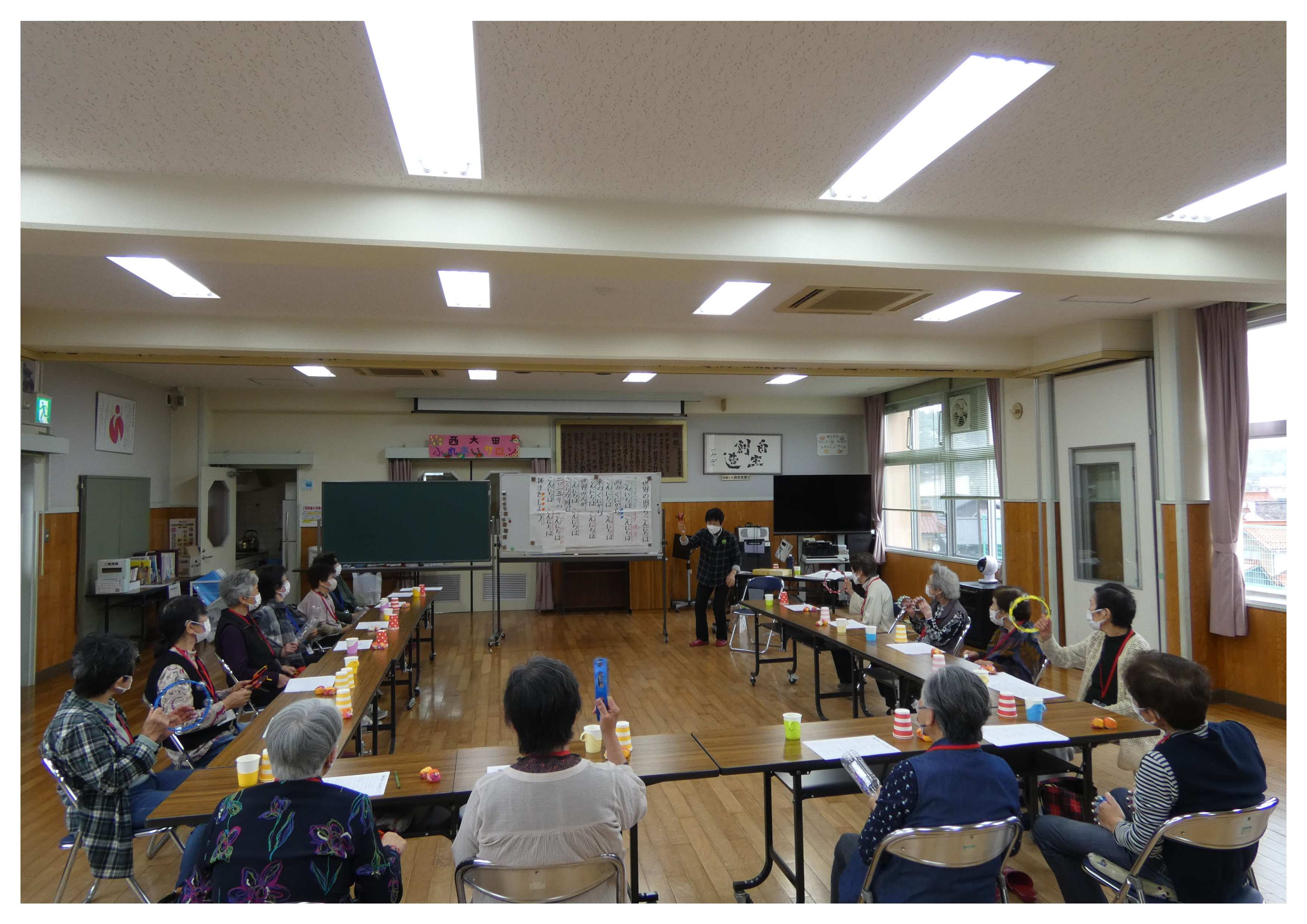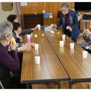 午後からは体操をした後、穴埋め問題やピンポン玉を使ったゲームをしました。穴埋め問題の途中で