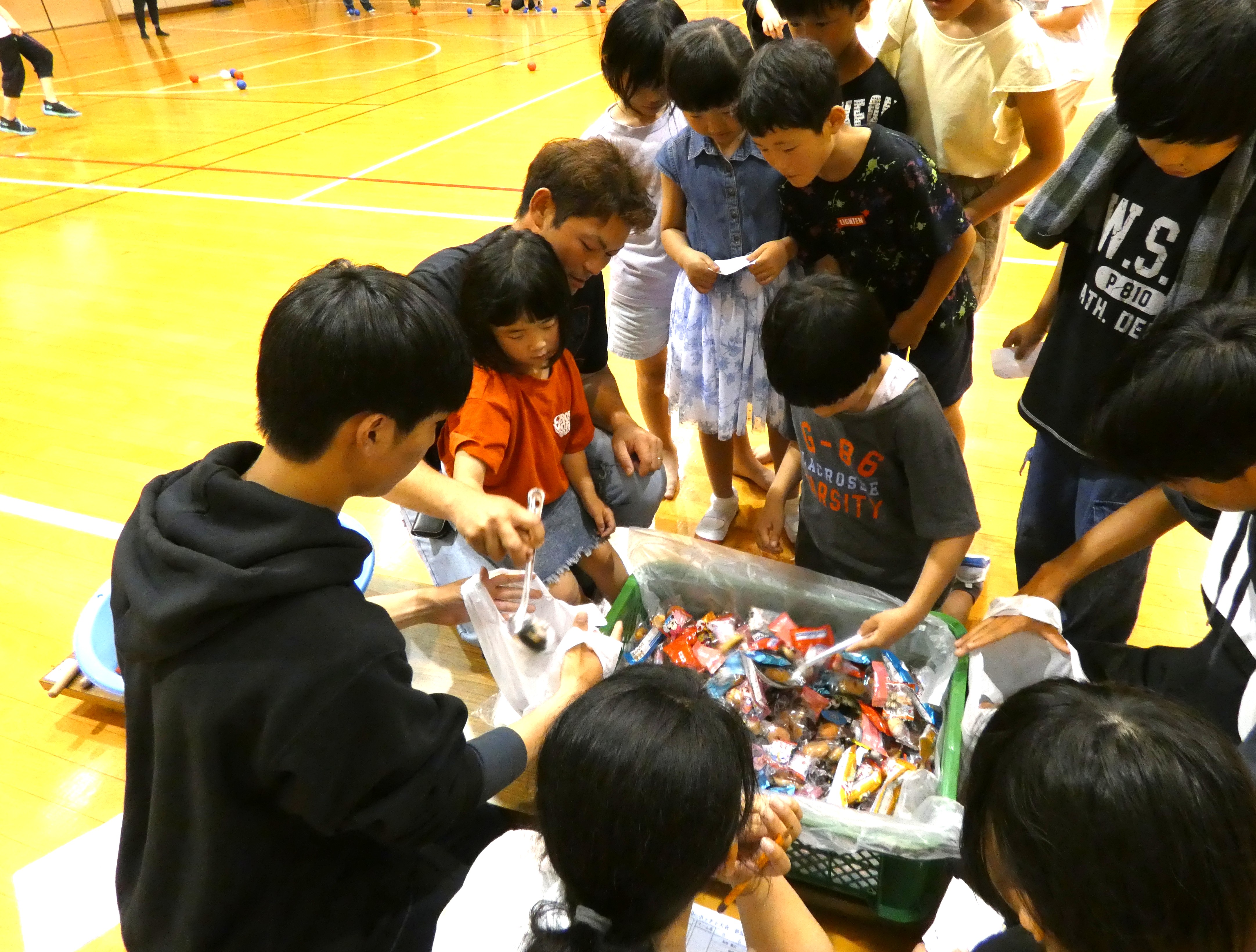 子ども対象の「お菓子すくい」もあり、小さな子ども達はひしゃくで、小学生以上は制限