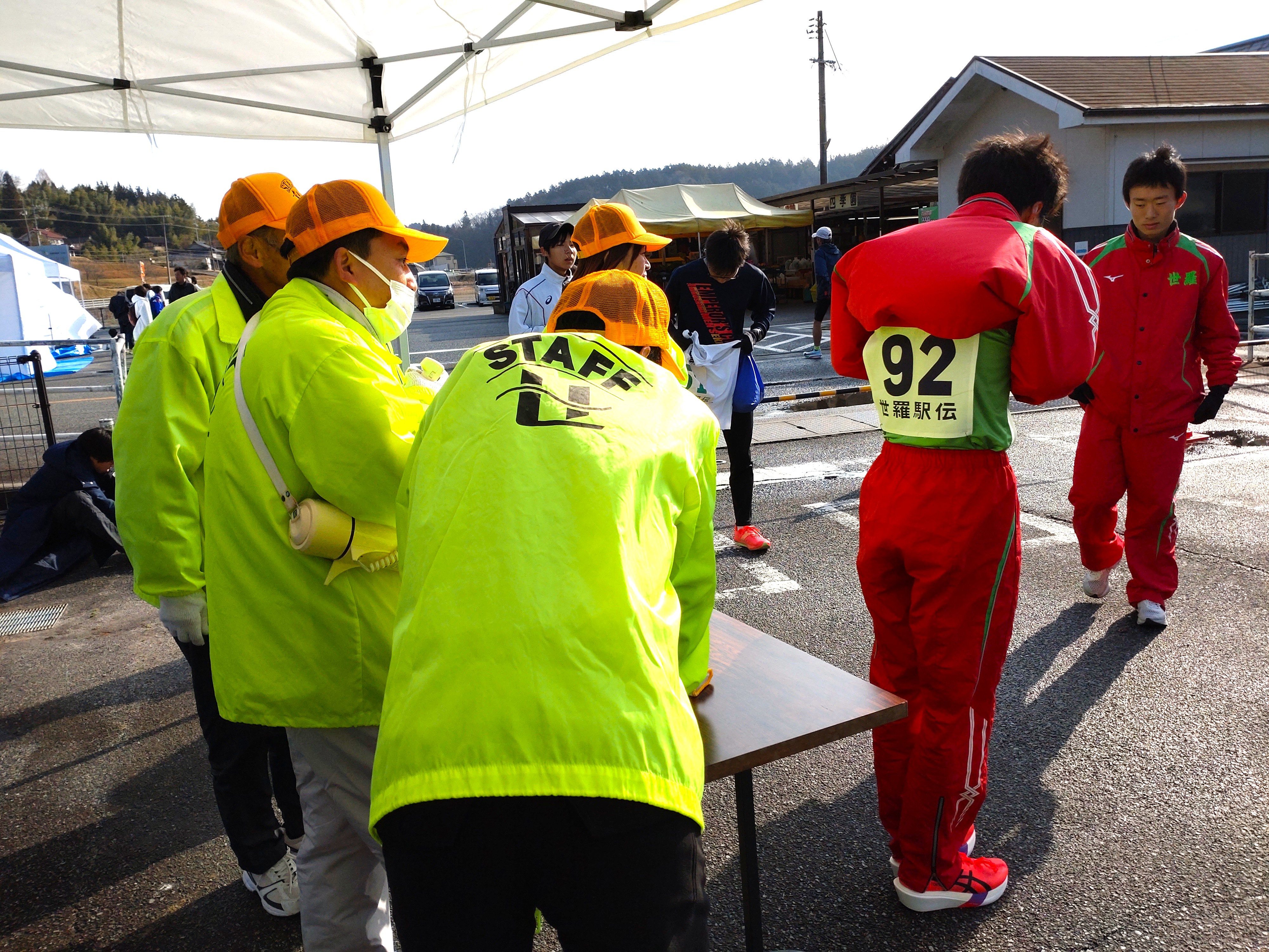 の方が中継所(四季園にしおおた)の準備にあたってくださいました。強風でカラーコーンが何度も